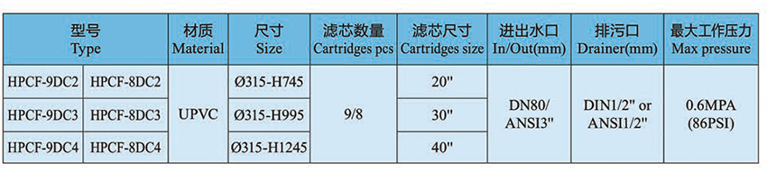 3.The distribution system of HPCF filters is distributed from bottom to top. Water is well-proportioned with small strike to cartridges and air is easy to be discharged.